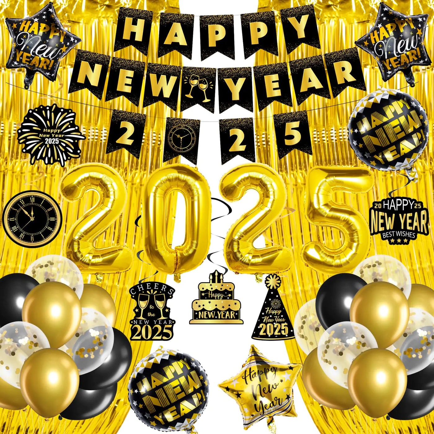 New Years Eve Party Supplies 2025 New Years Decorations 2025 Happy New Year 2025 Decorations Kit New Year Banner Foil Balloons Gold Foil Curtain Backdrop for New Year Eve Party